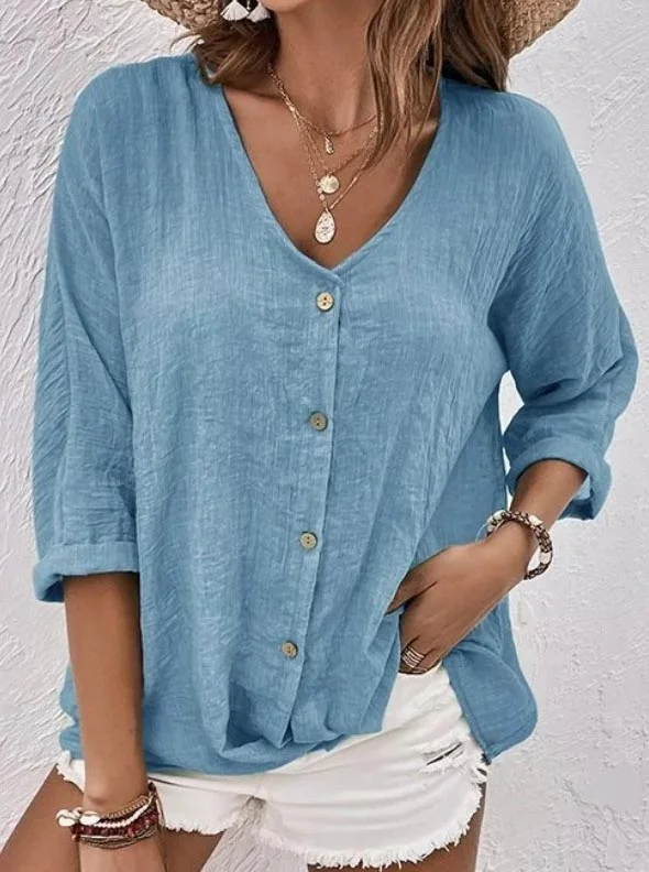 ND | Tania - Haut confortable à manches longues en coton et lin avec patte de boutonnage et col en V